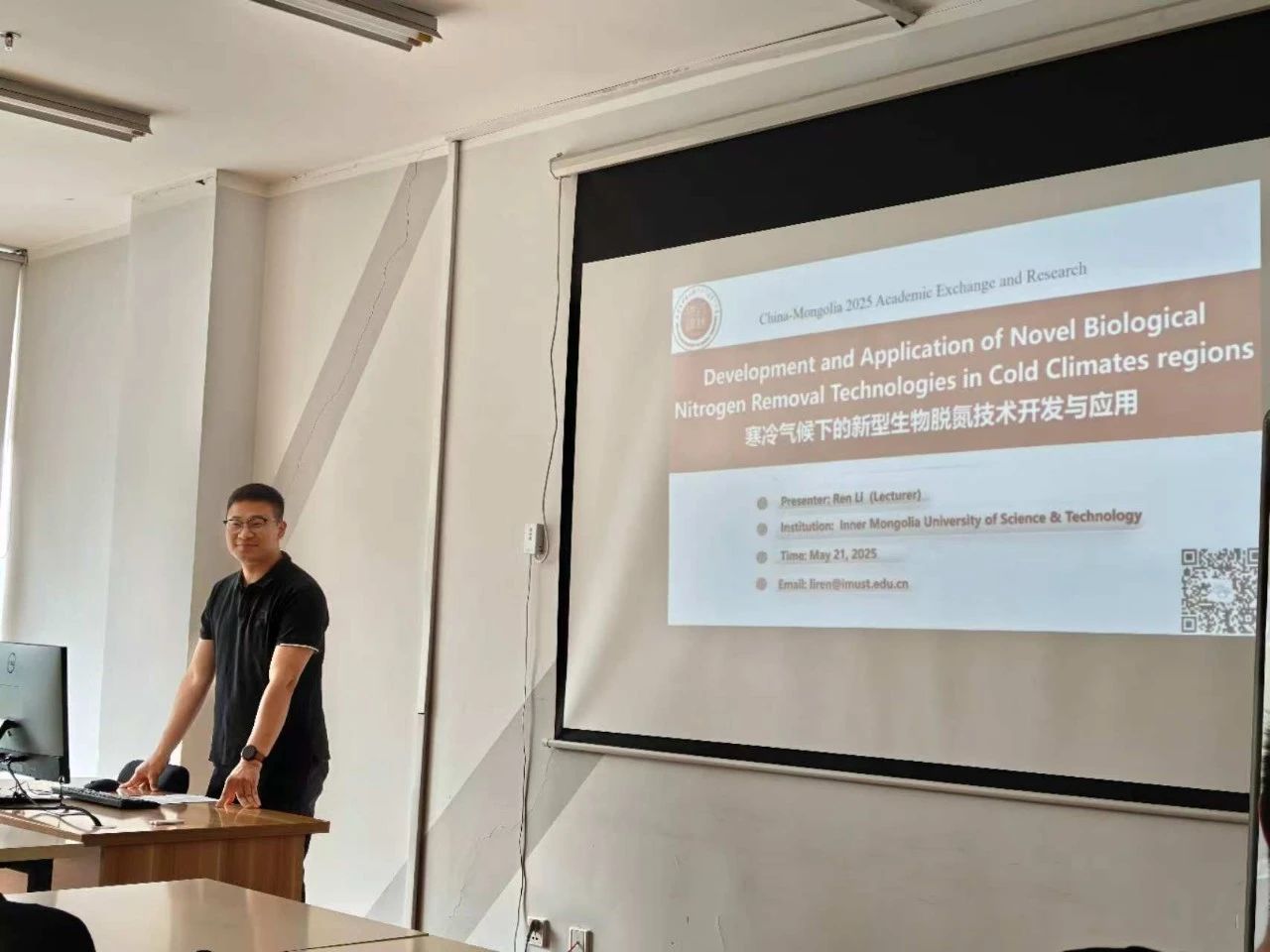 5月21日,蒙古国立大学工程技术研究院经理Sonomdagva教授亲切接待了团队人员,详细介绍了工程技术研究院环境科学与工程专业的建设历程与研究方向。李韧老师和硕士研究生张宝平分别向蒙古国立大学师生作《R&D and application of novel low-temperature nitrogen removal technologies》《Advances in wastewater treatment: low-temperature adaptation, carrier development, antibiotic response, reactors》的主题报告,系统展示了公司黄河流域寒旱区水土环境研究中心的研究方向和进展。双方就中蒙污水处理技术的差异性和所面临的不同挑战进行深入交流。