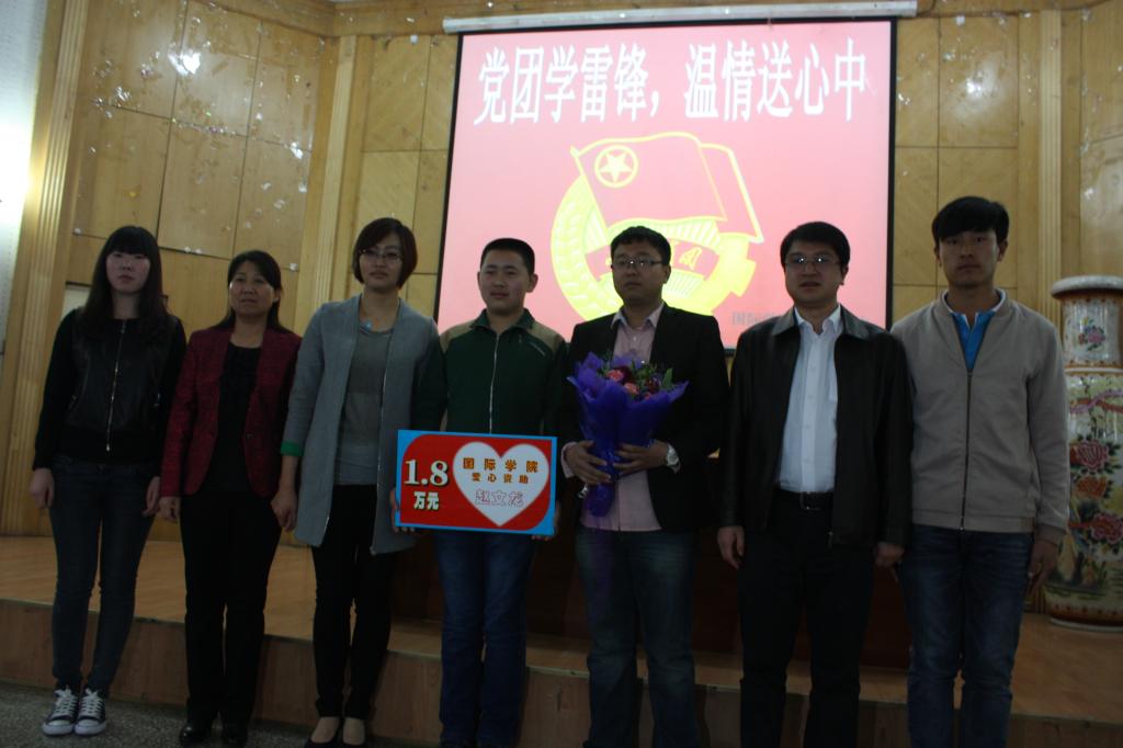 3月30日上午,国际公司团总支组织员工在F108举办“学习雷锋”爱心捐赠仪式,公司团委和学工部相关负责人及必一运动党、团组织负责人参加了此次仪式。仪式上邀请到了去年评选为“全国最美孝心少年”的我市初二员工赵文龙和他的班主任。公司团总支在“学习雷锋”活动月中通过发放倡议书和召开倡议会,组织员工干部发动班级员工为赵文龙小朋友捐款,参与师生达2000多人,共计捐款18000元。我们希望通过这一实际行动教育公司的老员工树立社会责任感,有爱心和孝心,并将雷锋精神真正的落到实处。